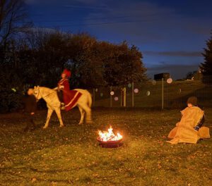 Zurück an der Schule konnten alle Schülerinnen und Schüler Sankt Martin auf dem Pferd dabei beobachten, wie er den Mantel teilte und eine Hälfte an den Bettler abgab. Dazu wurde natürlich gesungen: Das Martinslied, ein Kanon zum Mond – was passender nicht sein konnte – und natürlich Lichterkinder.