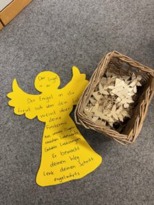 Unsere Religionslehrerinnen Frau Schneider und Frau Koll hatten mit den Kindern den Gottesdienst zum Thema Engel vorbereitet. In der Predigt wurde deshalb natürlich auch von Engeln berichtet und wir hörten und sahen eine schöne Bilderbuchgeschichte, in der von den Tieren und ihren Kindern die Rede war, die häufig Engeln begegnen. Zum Schluss erfuhren wir, dass die Engel aber auch besonders gerne die Menschkinder begleiten – und vor vielen Jahren die Nachricht über ein ganz besonderes Kind verbreiteten.
